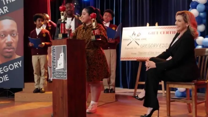 Black leather tote bag worn by Ava Coleman (Janelle James) as seen in Abbott Elementary TV show wardrobe (S02E19)Submit a matchBy Olive