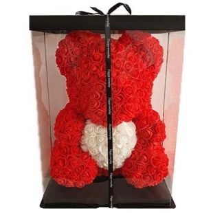 Ours en Rose Rouge avec Cœur Blanc – 35 cm De Hauteur – 25 cm De Largeur + Boite Happy Everyday