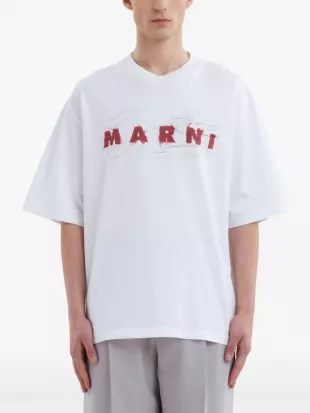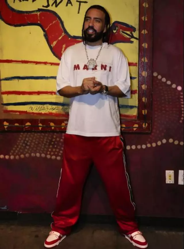 Marni White & Red Wrinkled Logo T Shirt worn by French Montana on the Instagram account @frenchmontana
