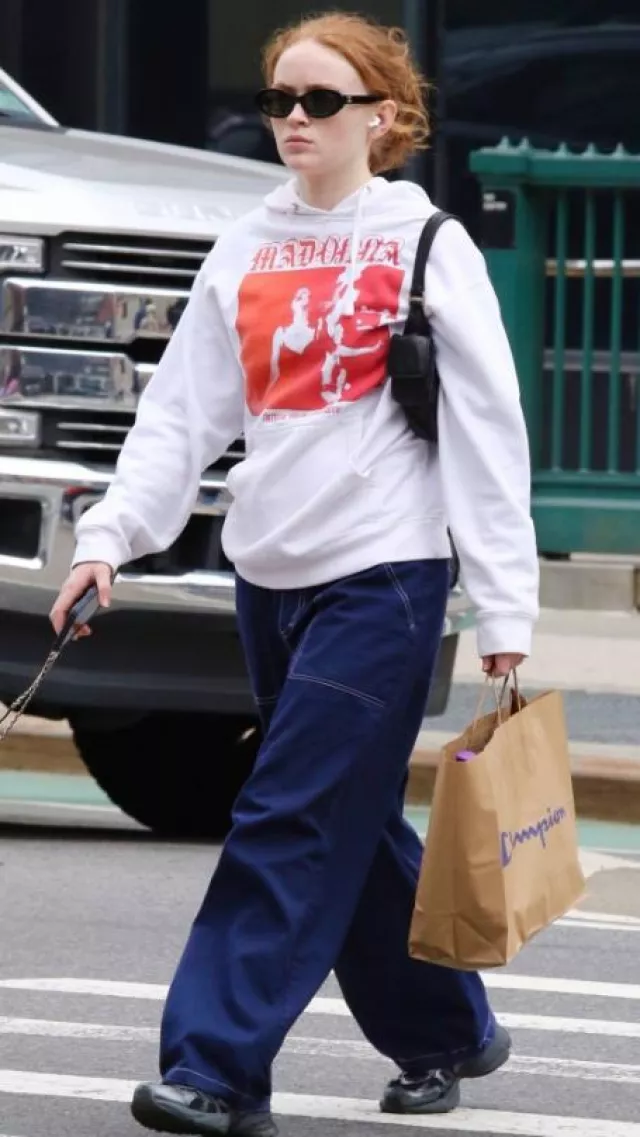Miu Miu Nappa Leather Pocket Bag worn by Sadie Sink in New York City on April 10, 2024