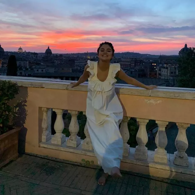 Three Graces Geraldine Ruffle Neck Maxi Dress worn by Selena Gomez Capri July 23, 2019