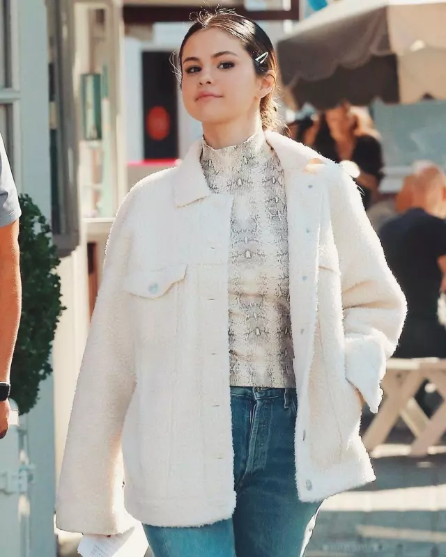 Leset Sophia Snake Print Ribbed Stretch Modal Turtleneck Top of Selena Gomez on the Instagram account @selenagomez November 7, 2019