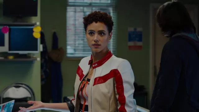 Diesel white and red leather jacket worn by Ramsey (Nathalie Emmanuel) as seen in Fast X