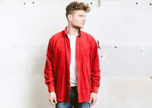 Chemise en velours côtelé hommes des années 90. Chemise rouge foncé minimaliste copain cadeau chemise Vintage Grunge cordon manches longues chemise homme pour lui. Grande taille