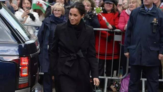 The black coat, Stella McCartney worn by Meghan Markle on his tour of Wales