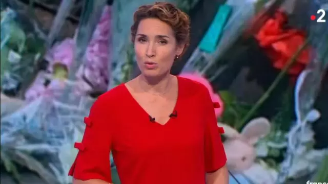 The red dress V-neck with knots on the sleeves Mare-Sophie Lacarrau in The 13H de France 2, 30/05/2018