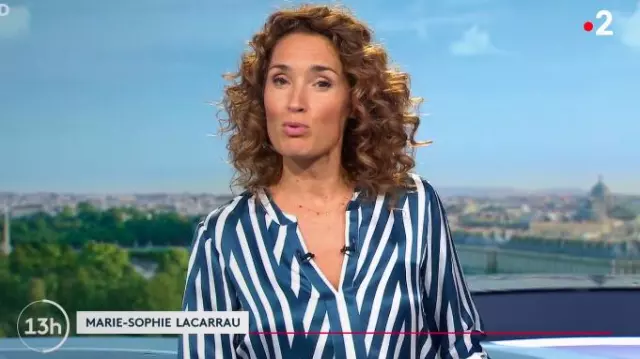 The blouse striped blue and white silk blended 1.2.3 of Marie-Sophie Lacarrau in the Journal of 13 hours the 18.09.2019