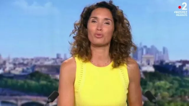 The yellow tank top perforations, decorative, details, ribbed Marie-Sophie Lacarrau in the Journal of 13 hours the 02.06.2020