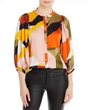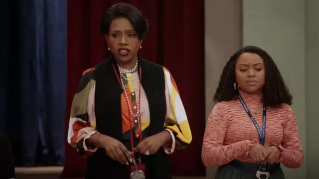 Karl Lagerfeld Paris 3/4 Blouson Sleeve Multicolor Printed Crew Neck Button Front Blouse worn by Barbara Howard (Sheryl Lee Ralph) as seen in Abbott Elementary (S02E12)