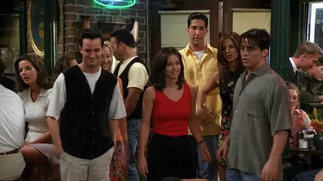 Chandler Bing Outfits: Matthew Perry is wearing Suit Vest in Friends TV series season 3, episode 1