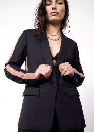 Wildfang Tux Blaser worn by Wickie Roy (Renée Elise Goldsberry) as seen in Girls5eva (S03E03)