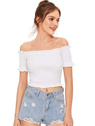 WDIRARA Women's Off The Shoulder Crop Tops Short Sleeve Ruch Lettuce Trim Blouse Tee White XS