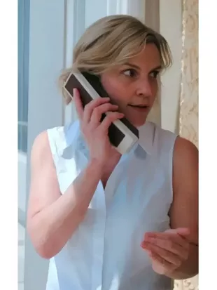 Pluribus 2025 Rhea Seehorn Sleeveless White Shirt worn by Carol Sturka (Rhea Seehorn) in Pluribus (S01)