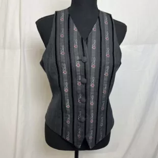 Bebe Women's Gray Musical Notes Vest worn by Charlie Cale (Natasha Lyonne) as seen in Poker Face (S01E07)