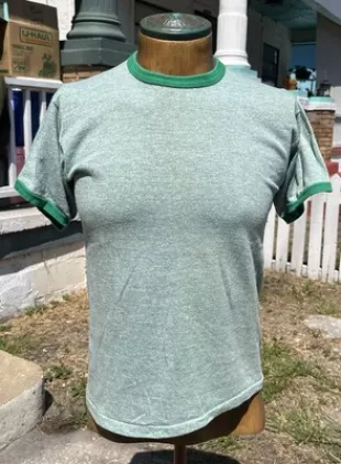 Russell Athletic 70's Vintage Soft Heather Green Ringer Baby Tee worn by Charlie Cale (Natasha Lyonne) as seen in Poker Face (S02E04)
