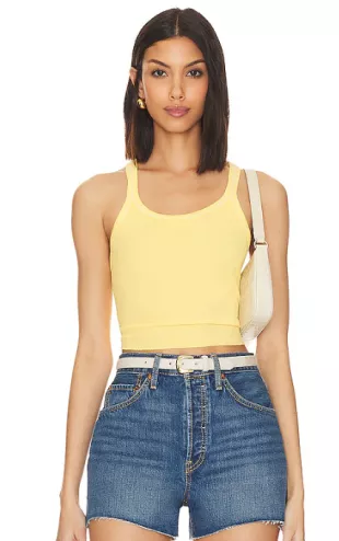 Re/Done Hanes Cropped Ribbed Tank en Yellow With Ivory Stitch worn by Charlie Cale (Natasha Lyonne) as seen in Poker Face (S02E06)