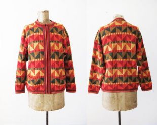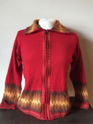 Cardigan en alpaga vintage géométrique Knit Cardigan pull pull péruvien rouge Orange Zip Up Medium pull en tricot