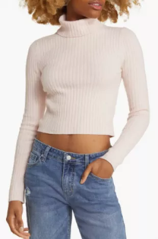 B.P. Rib Crop Turtleneck Sweater in Pink Crystal worn by Jenn Tran as seen in The Bachelorette (S21E02)