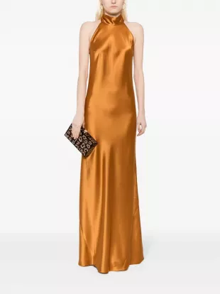 Galvan Sienna Satin-Finish Maxi Dress in Brown worn by Jenn Tran as seen in The Bachelorette (S21E02)