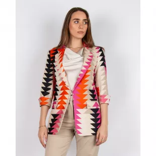 Vilagallo Clover Triangle Print Turn Back Cuff Blazer Beige Multi worn by (Prue Leith) as seen in The Great British Bake Off (S15E01)