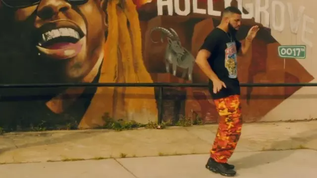 The Pants camouflage orange door Drake in her video clip for "In my feelings"
