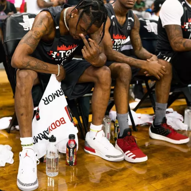 Las zapatillas Air Jordan 3 Retro "katrina" que lleva Travis Scott en su cuenta de Instagram