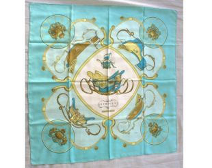 HERMÈS, foulard vintage de la maison HERMÈS Paris Springs de Philippe Ledoux en Twill de soie Collector dans les tons bleu 90 x 90 cm