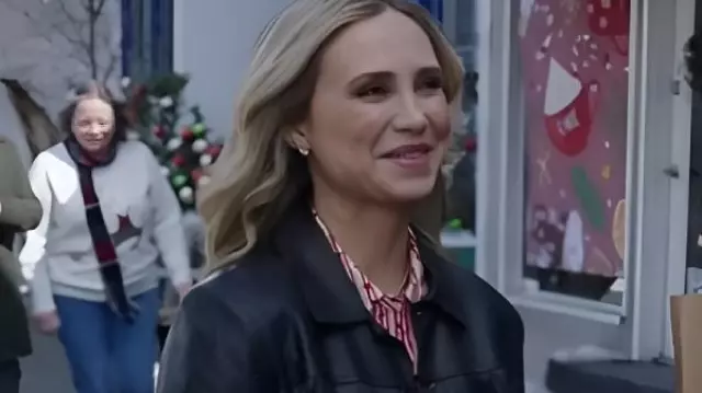 Una chaqueta de cuero de Royal Montana Christmas 2025 Fiona Gubelmann usada por Victoria (Fiona Gubelmann) como se ve en A Royal Montana Christmas