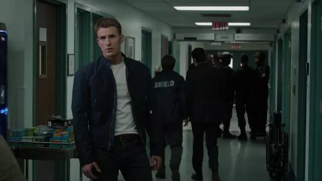 Chaqueta de motociclista azul usada por Steve Rogers (Chris Evans) como se ve en Captain America: The Winter Soldier