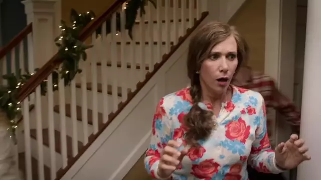 Suéter de flores rojo azul blanco usado por Audrey (Kristen Wiig) en Where'd You Go, Bernadette