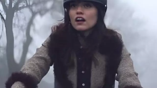 Abrigo largo de madera de Film Club usado por (Aimee Lou Wood) como se ve en Film Club
