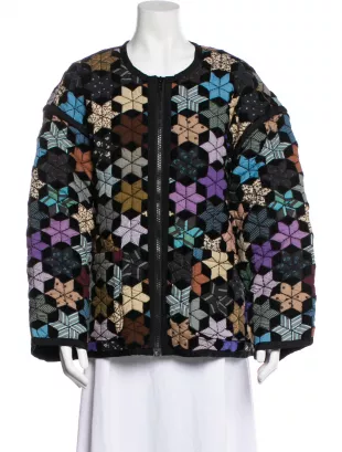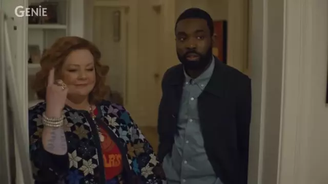Chaqueta acolchada de flores geométricas marinas usada por Flora (Melissa McCarthy) como se ve en la película Genie