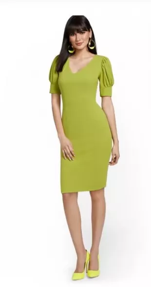 New York & Company Puff-Sleeve Sheath Vestido usado por Gayle King como se ve en CBS Mornings el 17 de agosto de 2023