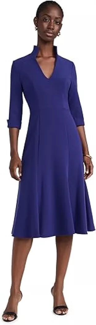 Vestido Kensington Halo negro en Dark Indigo usado por Celine Gounder como se ve en CBS Mornings el 24 de septiembre de 2025