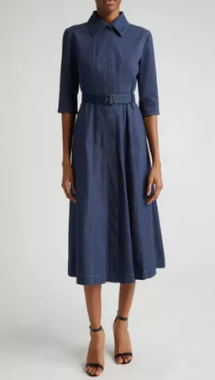Vestido camisero midi de mezclilla elástica Akris usado por Tory Johnson como se ve en Good Morning America el 13 de agosto de 2025