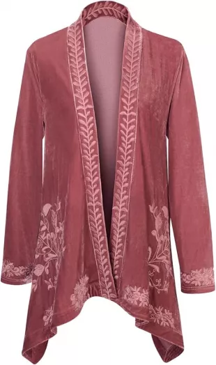 Embroidered Floral Burnout Velvet 3/4 Sleeve Open-Front Kimono