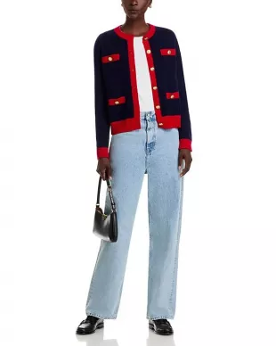 Cárdigan de cachemira con ribete de contraste de C by Bloomingdale's usado por Joy Behar como se ve en The View el 26 de septiembre de 2025