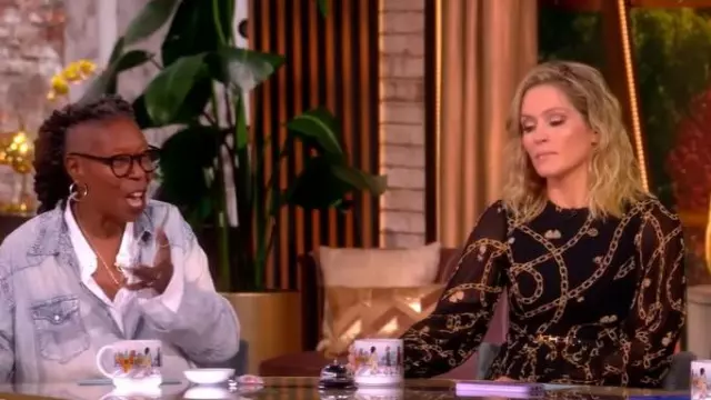 Vestido plisado de manga larga con estampado de cadenas Zimmermann con rayos de sol usado por Sara Haines como se ve en The View el 23 de octubre de 2025