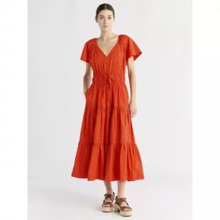 Vestido largo de algodón escalonado de ensamblaje gratuito usado por Makho Ndlovu como se ve en Hoy el 15 de julio de 2025
