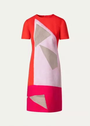 Vestido tubo de doble cara de seda de algodón de manga corta con estampado Akris Spectra usado por Andrea Mitchell como se ve en Today el 12 de agosto de 2025