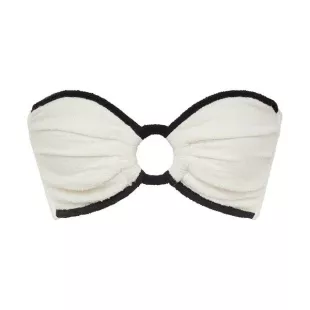 Top de bikini Montce Cream Black Binded Terry Rib Tori Ties Bandeau usado por Hilary Banks (Coco Jones) como se ve en Bel-Air (S03E10)