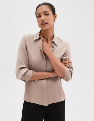 Camisa ajustada Theory en georgette de seda usada por Vanessa Rojas (Lisseth Chavez) como se ve en Chicago P.D. (T12E15)
