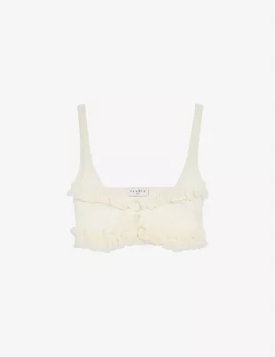 Sandro Barbara Ruffle Trimmed Stretch Knit Top usado por Mindy Chen (Ashley Park) como se ve en Emily in Paris (S02E07)