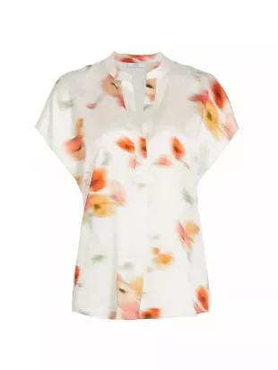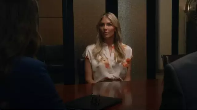 Blusa de seda con cuello de banda Vince Poppy Blur usada por Deanne Janson (Amanda Kloots) como se ve en Blue Bloods (T14E17)