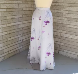 Falda larga sedosa con estampado de iris plateado y púrpura usado por Julie (Lauren Tom) en el programa de televisión Friends (S02E02)