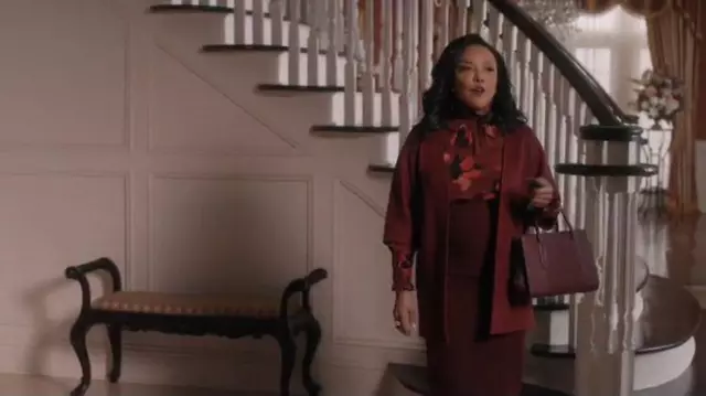 Akris Punto blusa floral roja de cuello con volantes usada por Lady Mae Greenleaf (Lynn Whitfield) en Greenleaf Temporada04 Episodio03