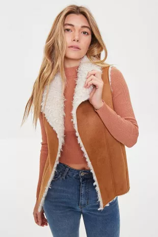 Chaleco abierto de gamuza sintética Forever 21 usado por Tia (Amanda Pérez) como se ve en How We Roll (S01E07)