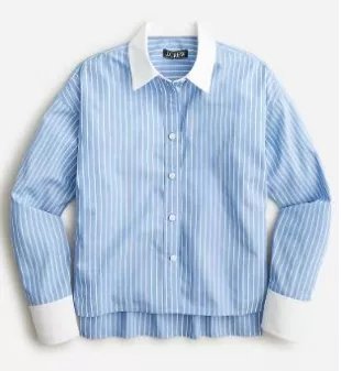 J Crew Camisa de popelina de algodón recortada de corte relajado en rayas fáciles usada por Evan Shepherd (Violett Beane) como se ve en Countdown (S01E13)