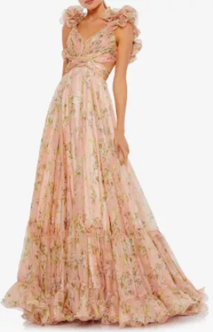 Vestido de gala recortado de gasa floral floral de Mac Duggal en rosa Multi usado por Abby Winbury (Dakota Fanning) como se ve en La pareja perfecta (S01E01)