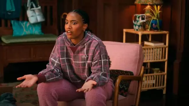 Sudadera con capucha Champion Classic Fleece en cuadros morados usada por Whitney Chase (Alyah Chanelle Scott) como se ve en The Sex Lives of College Girls (T03E09)